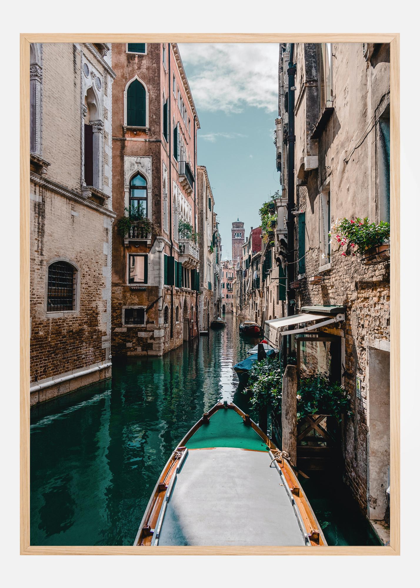 Denne fengslende posteren fanger essensen av en pittoresk kanal i Venezia, komplett med tradisjonell gondol i forgrunnen. Lyset faller vakkert over de fargerike fasadene av de omkringliggende bygningene, og refleksjonene i det stille vannet skaper en speiling som er både klar og fortryllende. Nyanser av jordlige røde og oransjefargede toner i bygningenes murverk kontrasteres med den rolige akvatiske blågrønne fargen på kanalen.