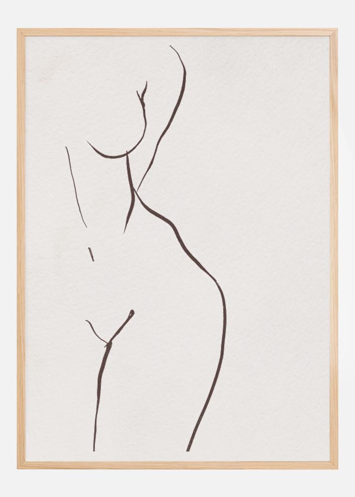 En figurtegningplakat av en kvinnes hofter. Sterke svarte linjer mot en hvit bakgrunn skisserer siden av en kvinne fra hoftene til skulderen hennes. Milde kurver fører blikket rundt formene hennes i dette flytende stykket. Heng opp dette på veggen din for et kunstnerisk uttrykk.