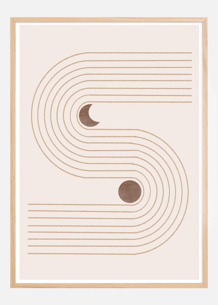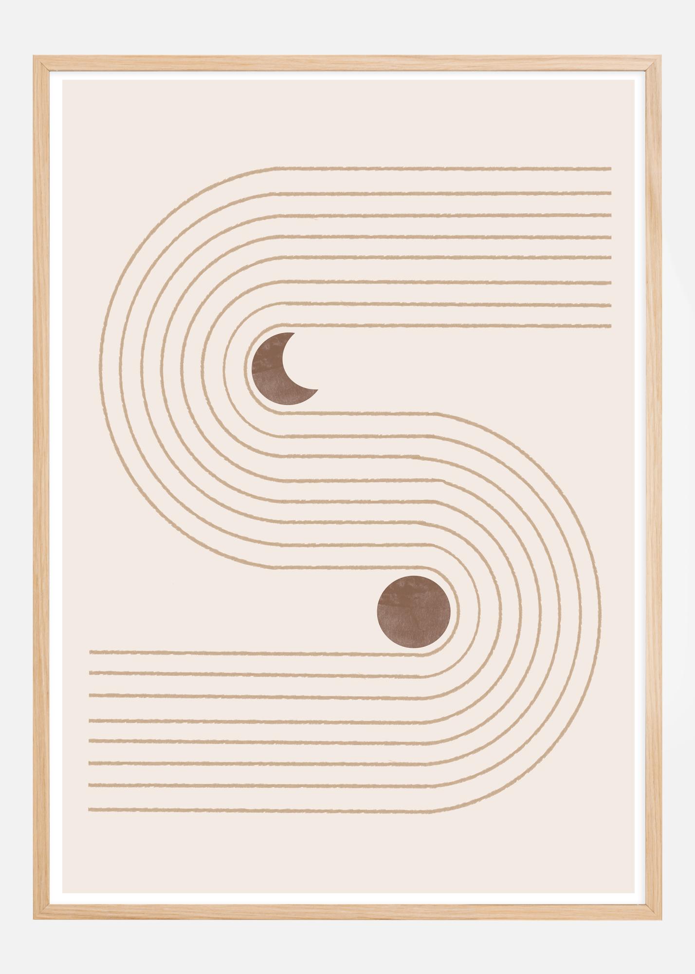 Denne posteren tilbyr en minimalistisk tolkning av bohemske former og himmellegemer med sine svepende buer og linjer som danner et harmonisk mønster. Den har en beroligende palett av jordnære nyanser, med innslag av mørkebrune sirkler som kan forestille måner eller planeter, noe som gir designen en kosmisk touch. Buene gir en følelse av bevegelse og flyt, mens de runde formene bidrar med et element av balanse og symmetri.