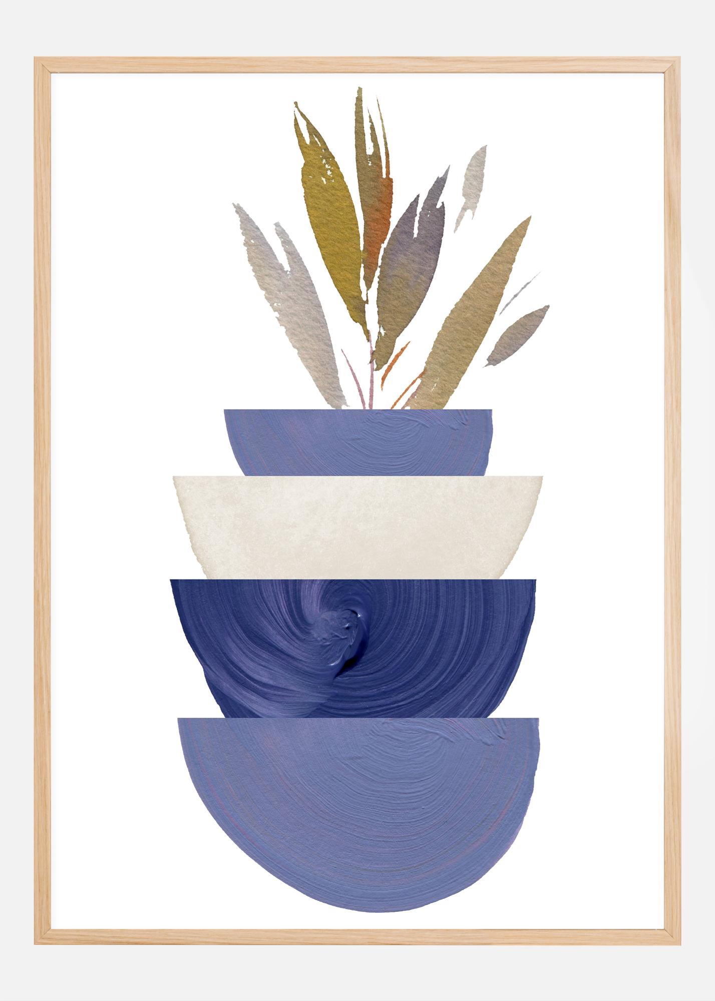 Denne moderne og kunstneriske plakaten avbilder en bohemsk bolle i en minimalistisk utførelse, perfekt for den som vil tilføre en følelse av ro og trendy design til sitt hjem. Motivet, som fokuserer på et harmonisk samspill mellom form og farge, framhever en stor bolle i nyanser av blått med en distinkt og bølgende tekstur som fyller den nedre delen av bildet. Oppå bollen hviler en plattform i en nøytral beige tone, på hvilken det står en annen, mindre bolle i en mørkere blå nyanse.