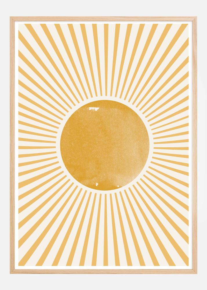 Denne livlige plakaten fremkaller følelsen av en strålende sol med sine utstrålte linjer i gulldtoner som omgir en sentral gul sirkel på en myk hvit bakgrunn. Designet er inspirert av bohemske og geometriske mønstre, som sammen skaper et bilde av solens varme og energi. De varme fargene og det strålende mønsteret er utformet for å gi en følelse av glede og positivitet.