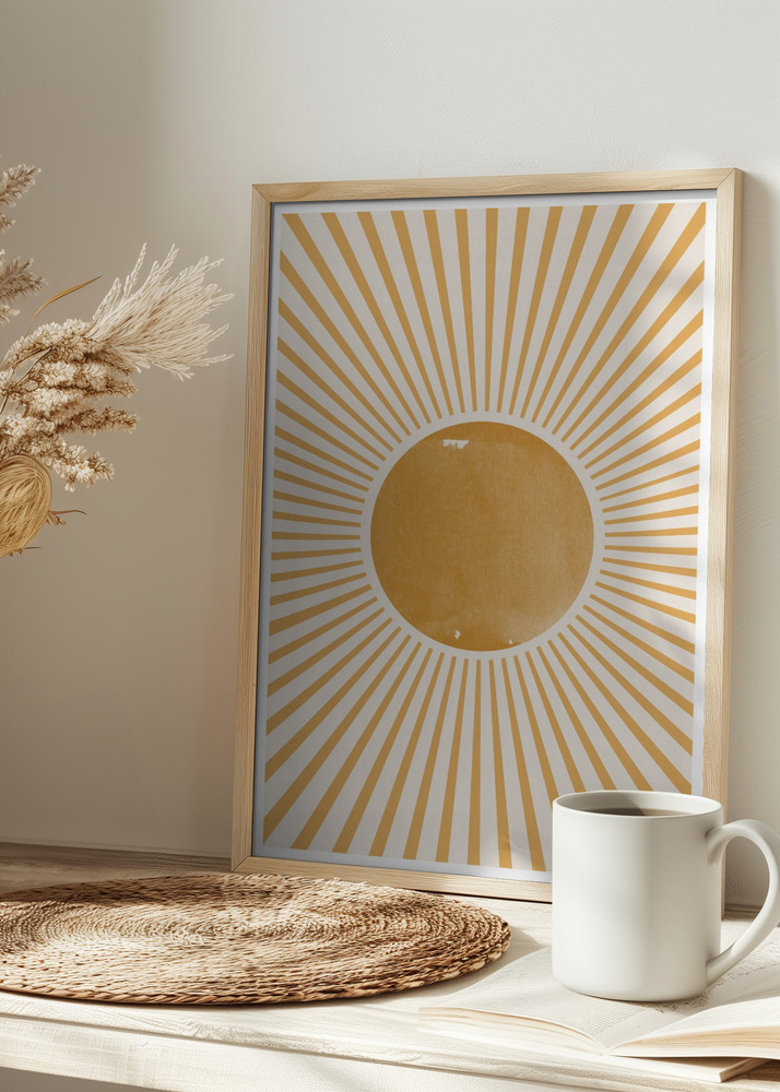 Dette trykket kan lyse opp hvilket som helst rom og gi en touch av boho-chic til din innredning. Den er perfekt for de som ønsker å innføre en bit av naturens skjønnhet og en følelse av lys i sitt hjem. Dens universelle symbol for solen gjør den til et velkomment tilskudd i mange forskjellige innredningsmiljøer, fra en stue til et yogarom eller et barnerom.