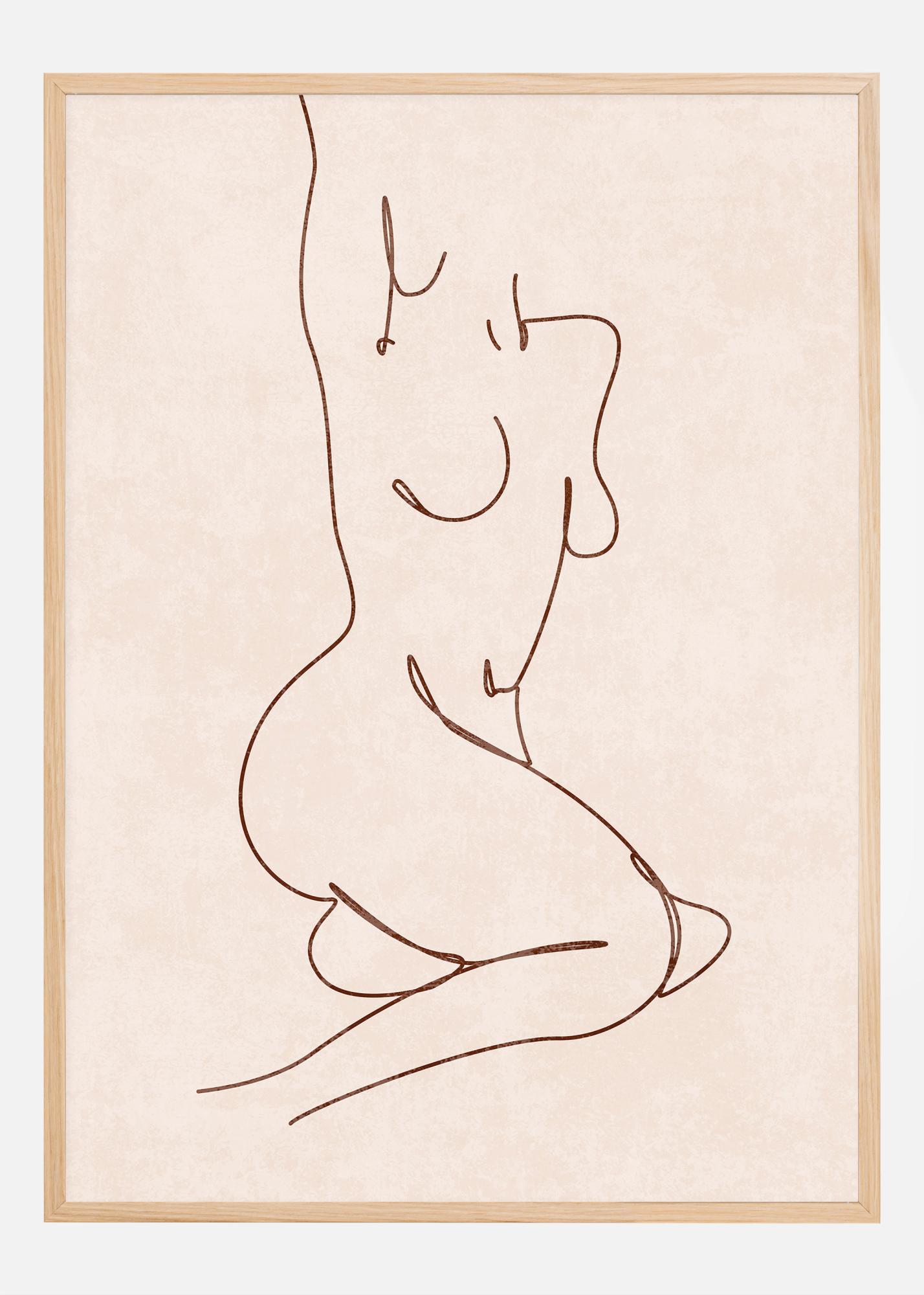 Denne elegante og minimalistiske plakaten fremstiller en kvinnelig figur i en enkel, flytende linje. Kunstens subtile uttrykk og den avdempede stilen er en hyllest til det skjønnes enkelhet. Den suggestive konturen skaper et sterkt bilde med minimal detalj, noe som gjør det til en moderne tolkning av den klassiske skjønnheten og kroppens naturlige kurver.