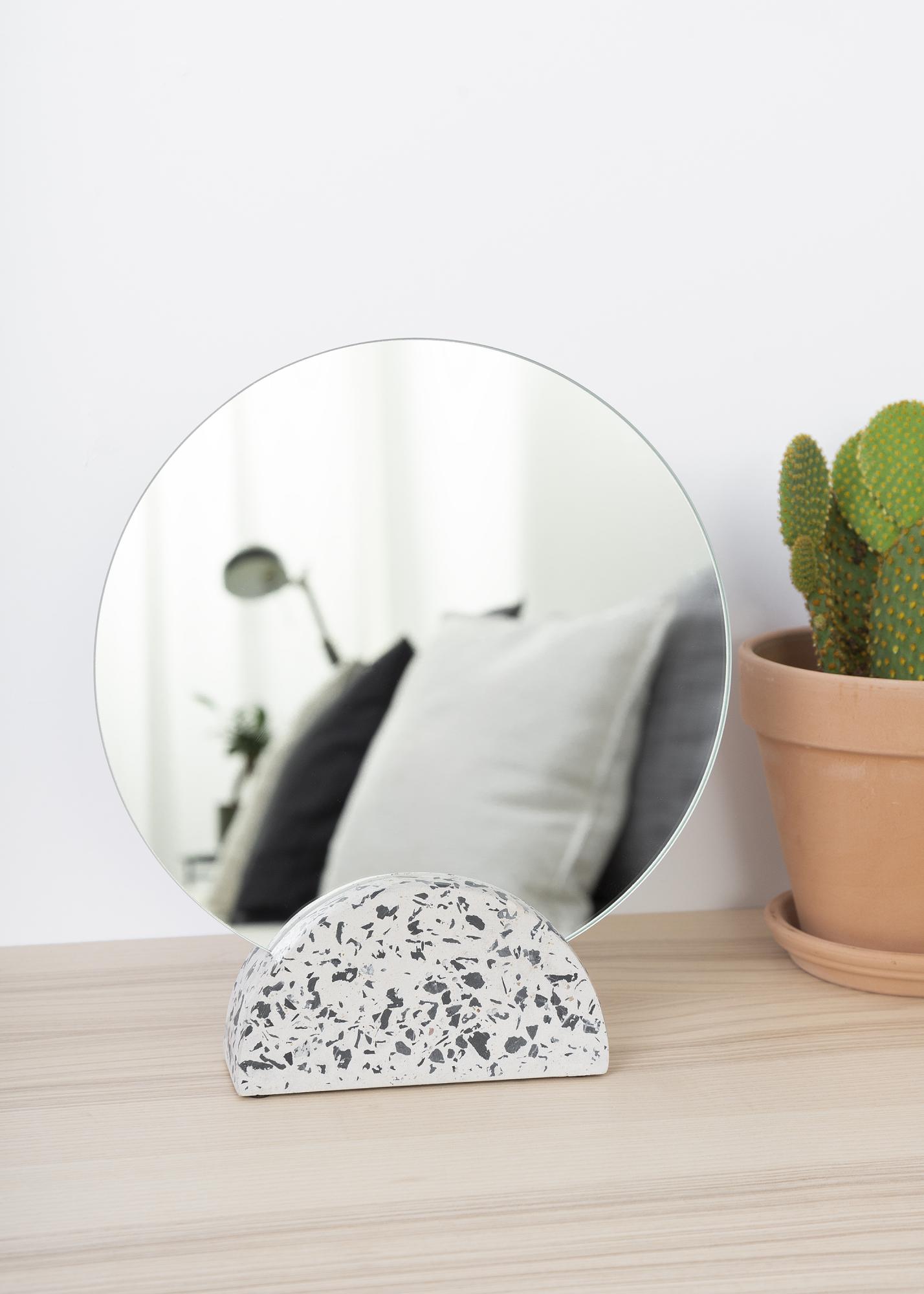Modern design på sitt beste! Dette runde bordspeilet fra danske Hübsch er både funksjonelt og stilig. Støtten er laget av vakker, hvit Terrazzo (kunststein) og komplimenterer det tynne speilglasset på en flott måte.