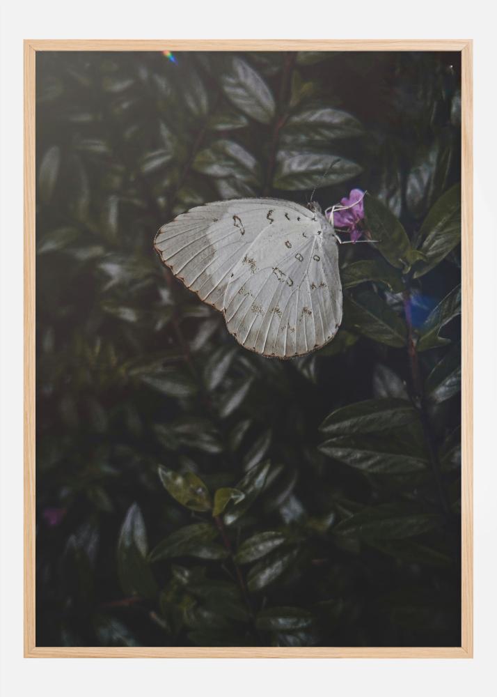 Oppdag naturens stille skjønnhet gjennom denne tankevekkende plakaten som skildrer en delikat sommerfugl i hvile. Den er elegant plassert mot en frodig bakgrunn av mørkegrønne blader, og hennes bleke hvite vinger med subtile mønstre av grått og svart fremhever hennes skjørhet og eleganse. Dette bildet er en stille påminnelse om naturens flyktige og fortryllende øyeblikk.