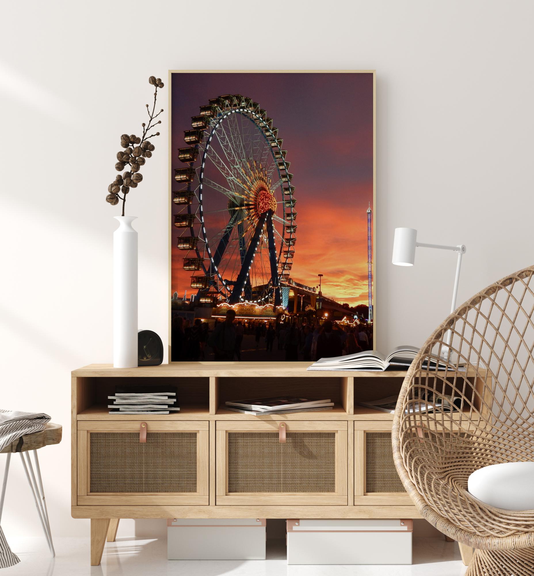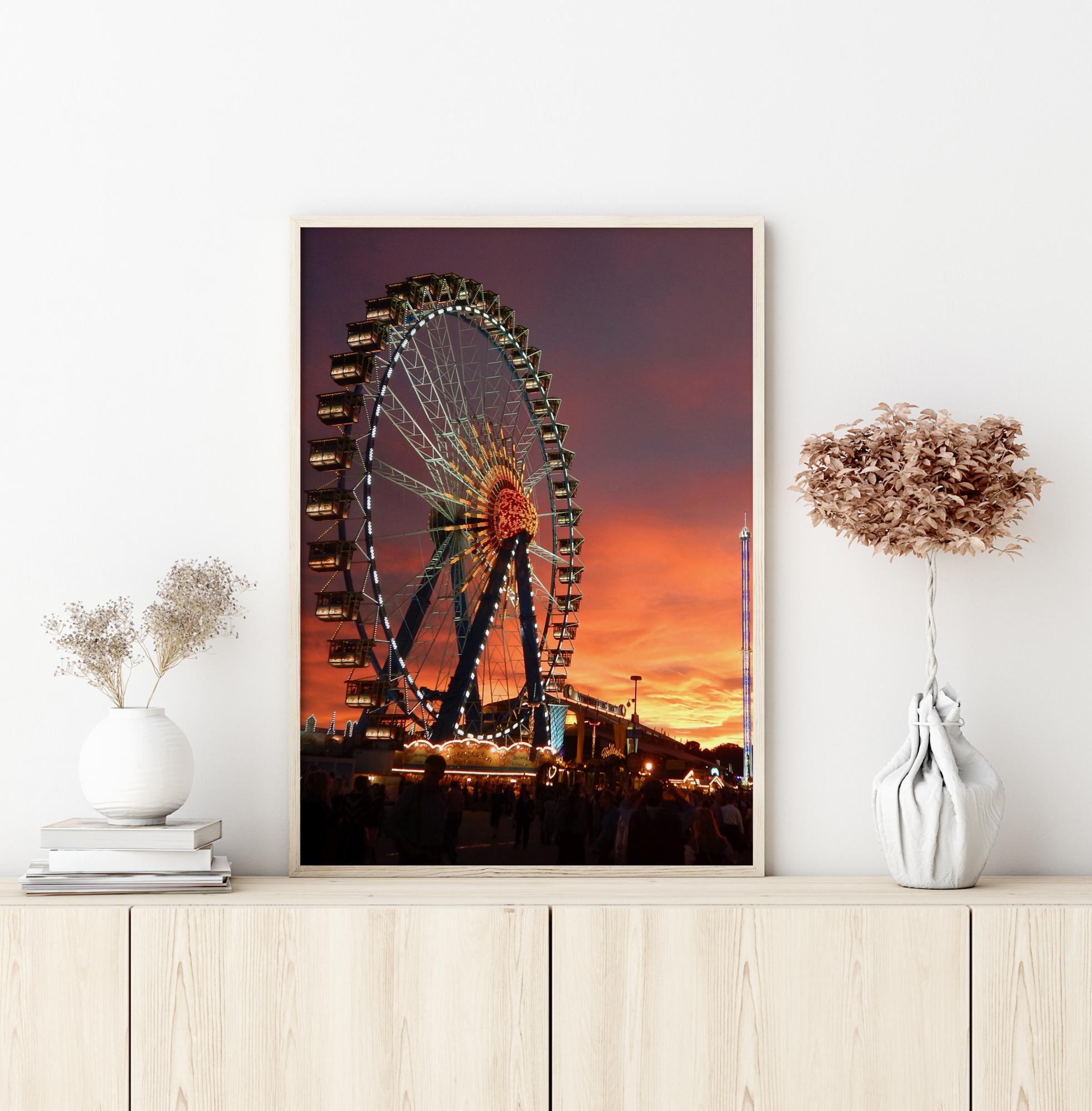 En fantastisk plakat av et pariserhjul om natten. Hjulet vises opplyst og glødende på venstre side. Nedenfor ser folkemengdene på hjulet mens solen går ned i en fantastisk oransje og lilla nattehimmel. Tilfør litt nattlig drama til veggene dine med denne plakaten.