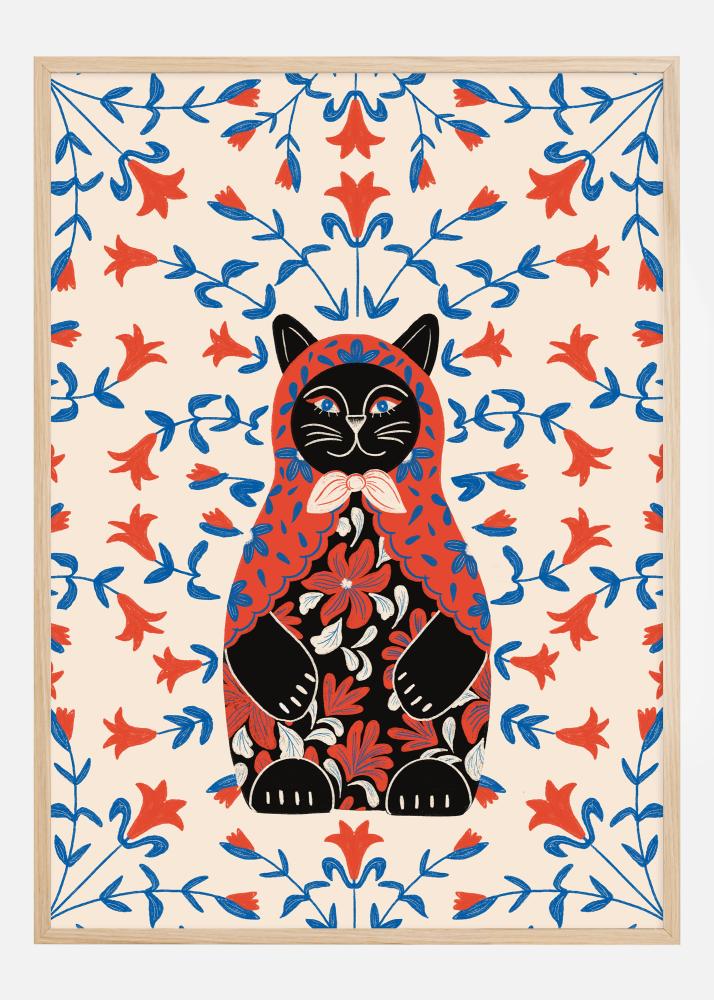 Denne fargerike og levende plakaten er en moderne tolkning av den klassiske russiske matryoshkaen, gjenskapt som en majestetisk kattfigur som sitter i sentrum omgitt av en frodig blomsterhage. Kattens blikk er gjennomtrengende og mystisk, mens dens pels er rikt utsmykket med intrikate blomstermønstre. Rundt katten brer et hav av røde og blå blomster seg utover mot en kremfarget bakgrunn, noe som gir et nesten hypnotiserende mønster som er både fengslende og vakkert.
