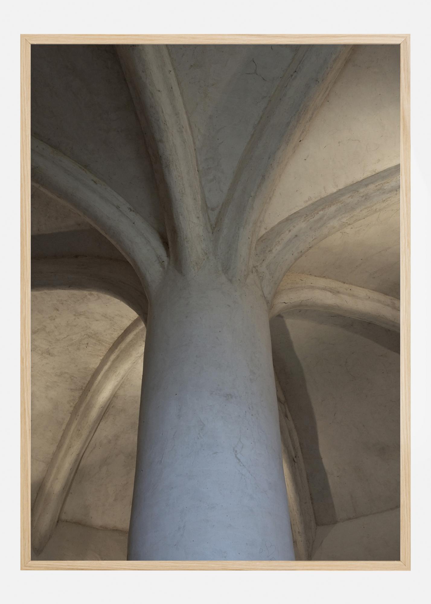 En arkitektonisk plakat av innsiden av et kapell eller kirketak. En enkelt kolonne står i midten og strekker seg mot taket, hvor åtte hvelv sprer seg ut som en blomst. Den kjølige steinen skaper en følelse av storhet som du kan nyte hjemmefra.