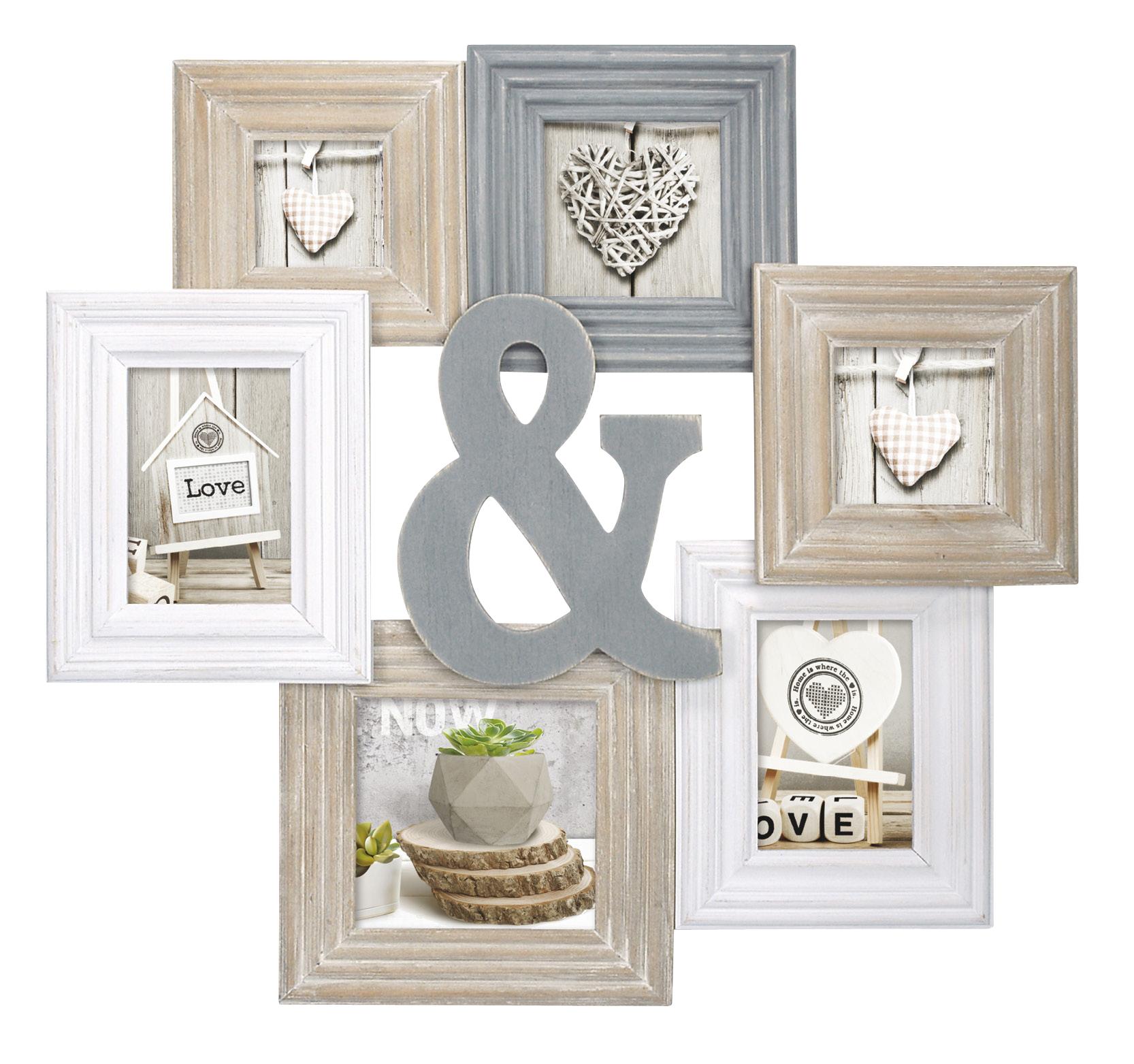 Har du problemer med å bestemme deg for hvilke av dine favorittbilder du skal ramme inn og pynte veggen din med? Ikke noe problem! Denne fine collagerammen har plass til hele 6 fine bilder i ulike format. Rammene har brede klassiske profileringer og de går i trefarget, grått og hvitt. I midten sitter et stort &-tegn som er malt i grått. Treet er behandlet for å se slitt og gammelt ut.
