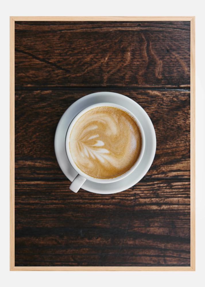 Denne innbydende og varmende plakaten er en hyllest til kaffekulturen og perfekt for enhver kaffeelsker. Et toppsyn av en klassisk hvit kaffekopp på en mørk brun treoverflate formidler en umiddelbar følelse av komfort og en pause i hverdagen. Skummet på kaffen har et fint kunstmønster, som inviterer til en stund med avslapning og nytelse.
