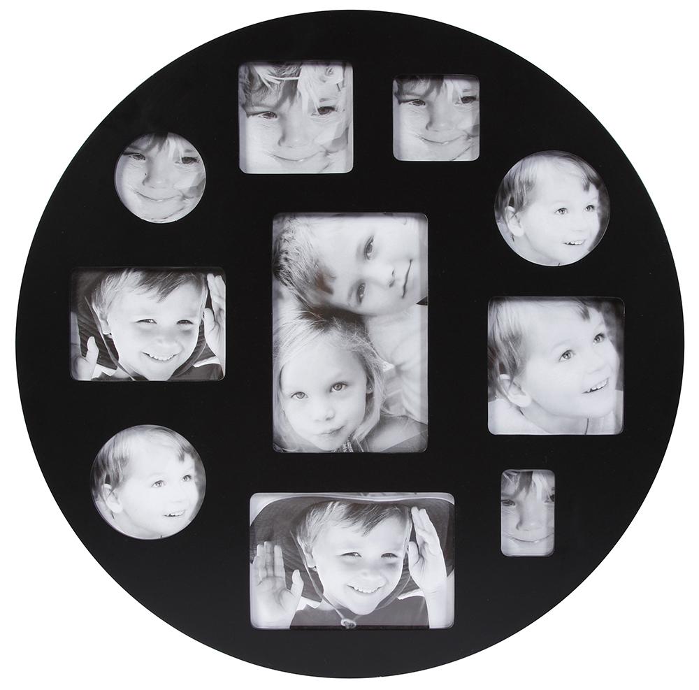 Rund collageram i trä som har plats för tio foton i olika storlekar. Finns i färgerna svart eller vit.