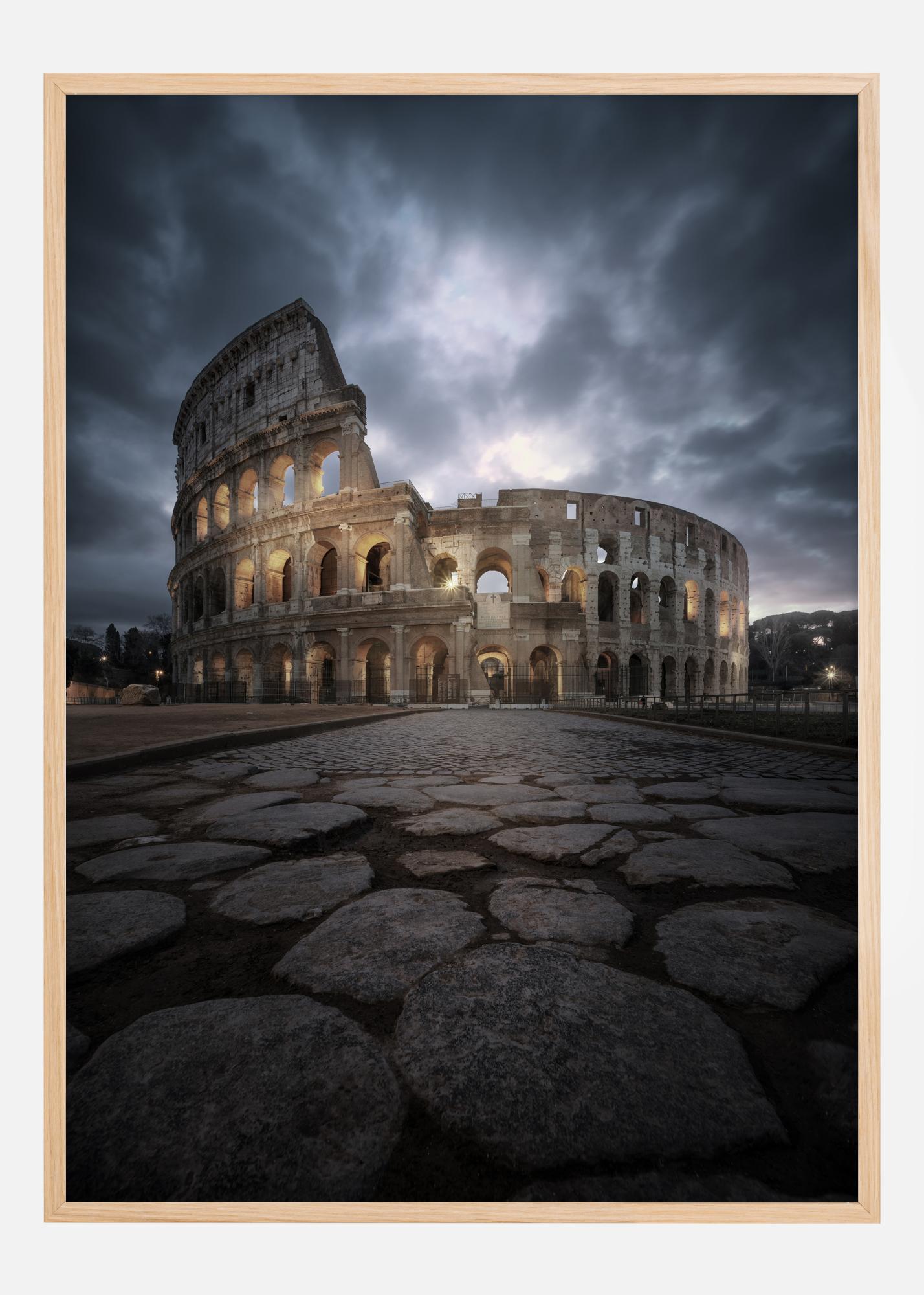 I motivet dominerer en palett av mettede og jordnære farger, fra den rike kullgrå til de varme gulaktige nyansene av stein som Colosseum er bygget av. Denne plakaten ville være en staselig interiørdetalj i ethvert moderne eller klassisk hjem, og gir en følelse av dybde og historie til rommet den plasseres i. De store steinplatene i forgrunnen leder betrakterens øye mot den majestetiske bygningen, hvilket skaper en følelse av nærvær og storhet.