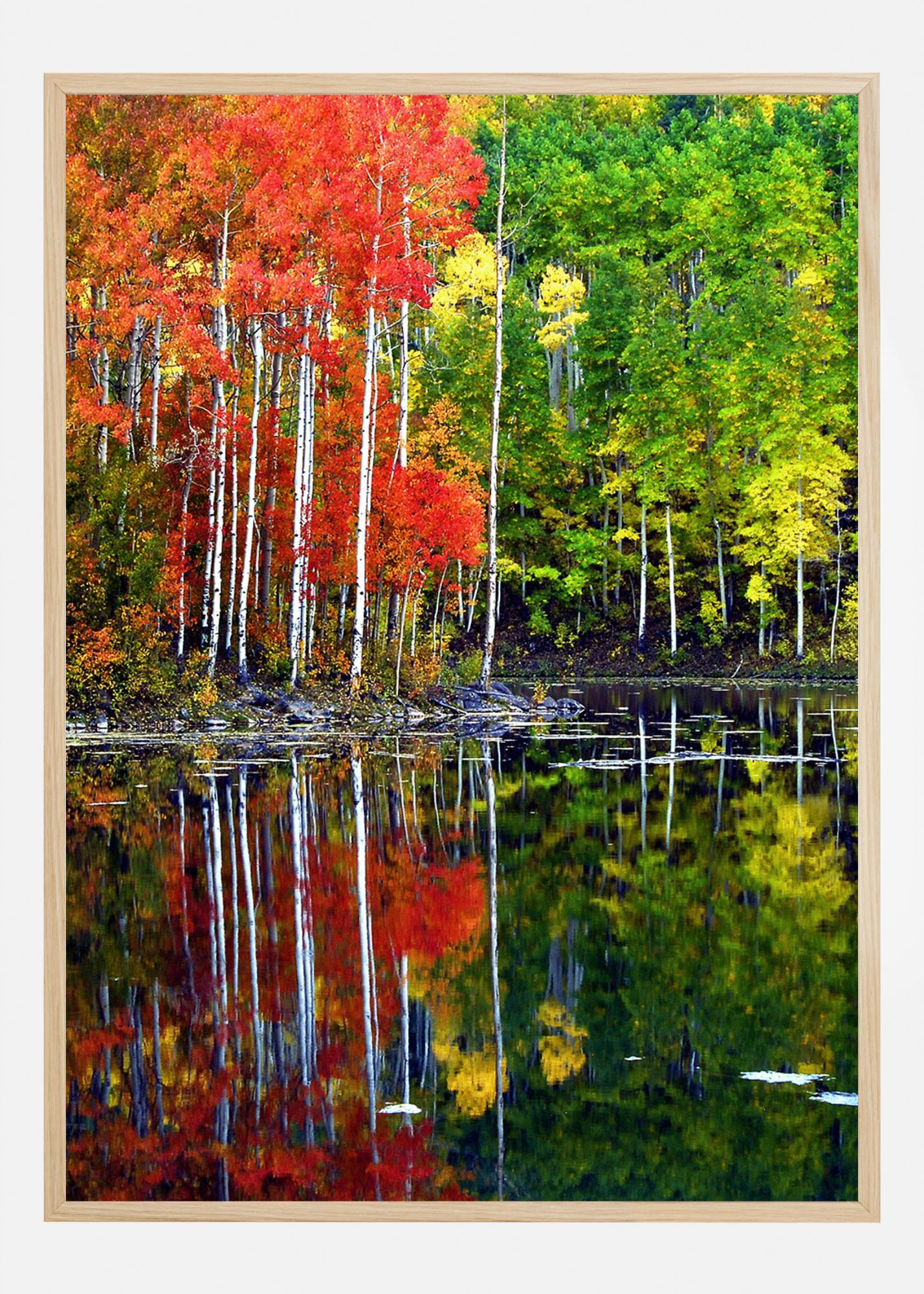 En lys plakat med en innsjø omgitt av trær. Vår og høst møtes i dette fargerike bildet med røde blader til venstre og grønt til høyre. Det hele kaster en tydelig refleksjon i den rolige innsjøen, som skaper en fargerik, men beroligende scene. Gled deg over naturen i hjemme ditt med denne plakaten.