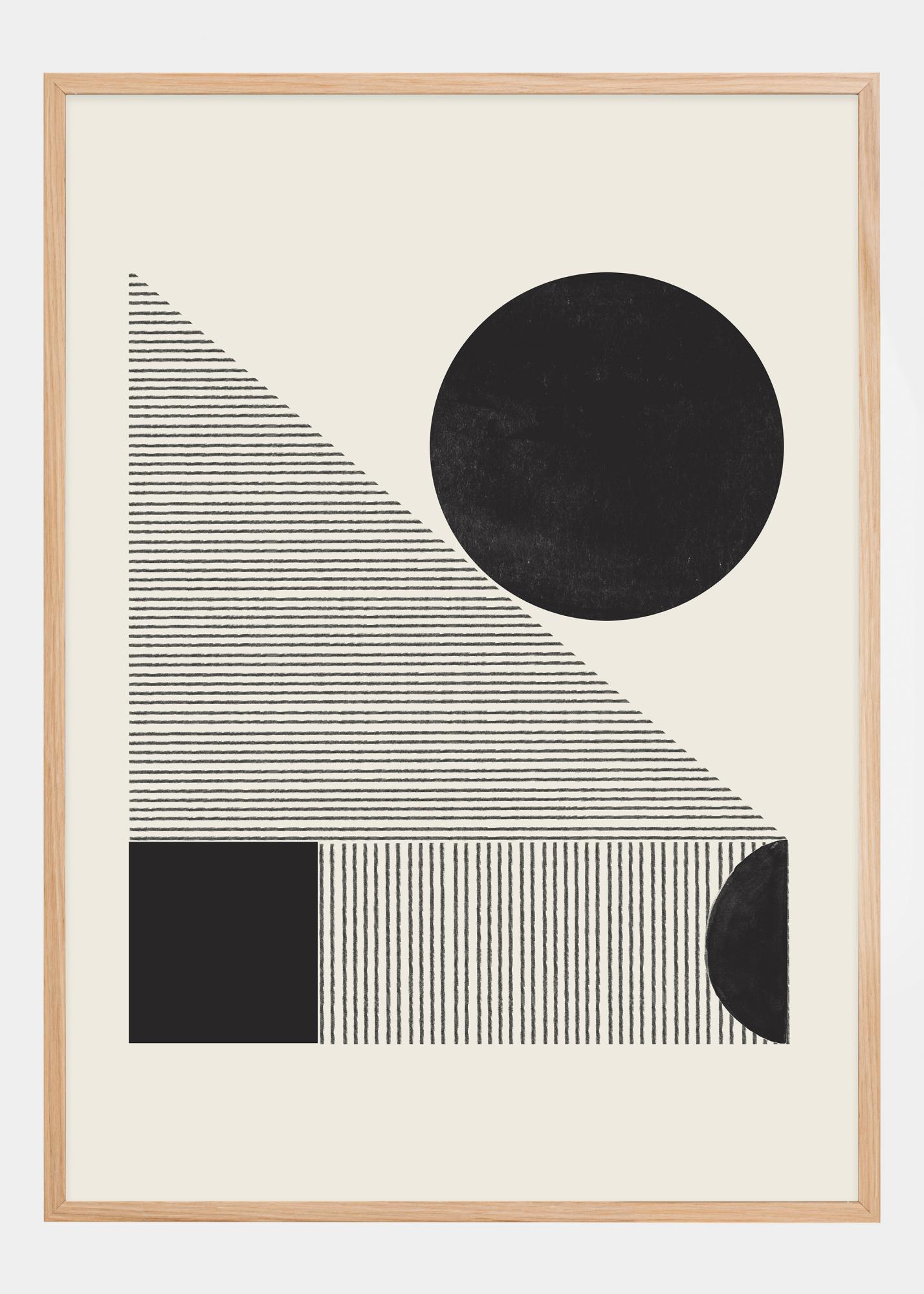 Denne plakaten er en leken og sofistikert tolkning av geometrisk abstraksjon. Sorte og hvite linjer samspiller i et nøye balansert mønster av former, mens den store sorte sirkelen dominerer øvre delen av komposisjonen og skaper en sterk visuell ankerplass. Det kontrasterende spillet mellom de fyldige sorte områdene og de hvite linjene inviterer betrakteren til å utforske de ulike teksturene og dybdene i bildet.
