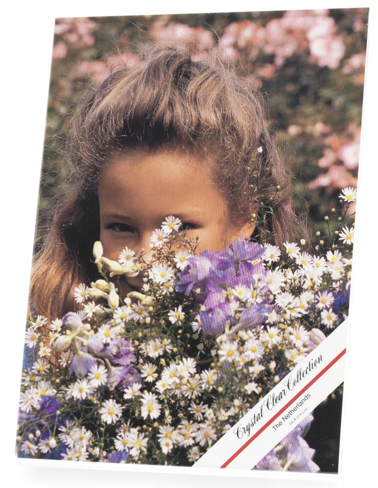 Bildeholder i gjennomsiktig plast. Bildeholderen lener bakover og passer derfor godt til å stå på for eksempel et bord.