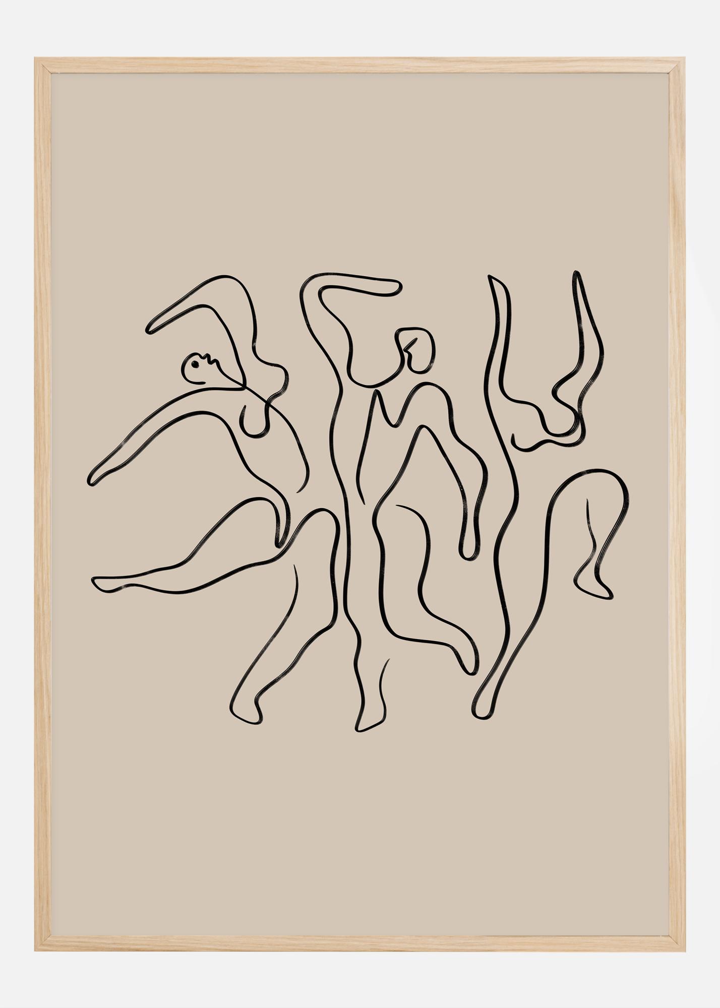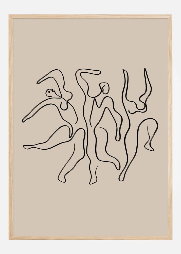 Denne kunstneriske plakaten presenterer en serie abstrakte figurer som gjennom sine flytende linjer fremstiller en følelse av bevegelse og dans. Den enkle men uttrykksfulle illustrasjonen i svart mot en rolig beige bakgrunn tilbyr et minimalistisk men levende uttrykk. Denne type motiv er perfekt for dem som verdsetter subtile men kraftfulle kunstverk som inspirerer til bevegelse og frihet.
