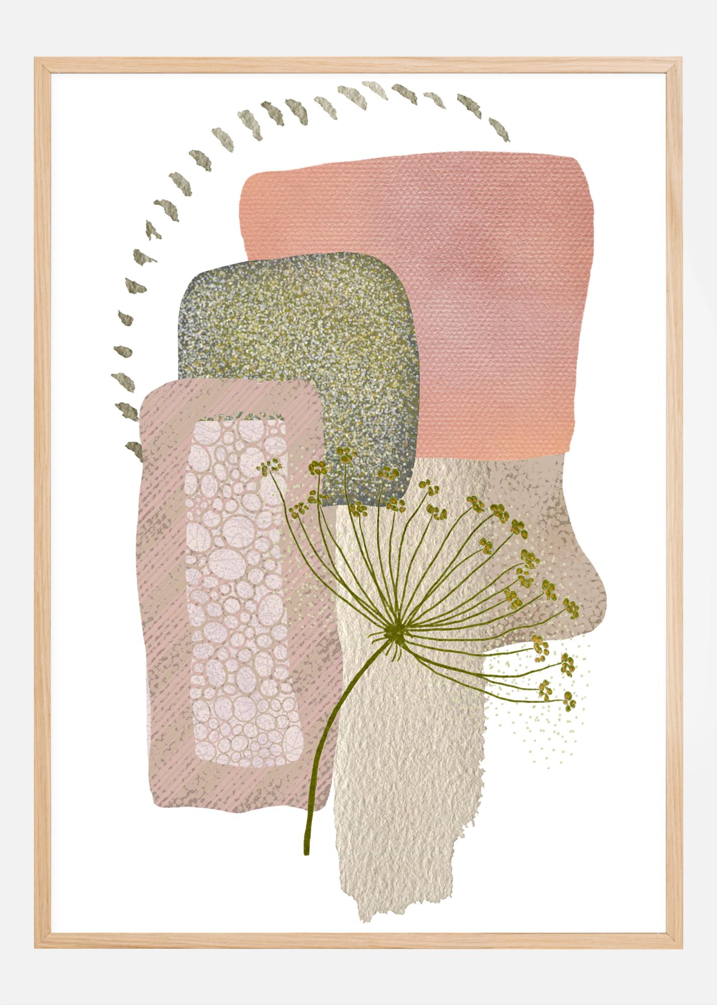 Denne plakaten gir en følelse av ro og skjønnhet gjennom dens avslappede kombinasjon av myke toner og abstrakte former. Sentralt i komposisjonen er en delikat blomsterstilk som strekker seg oppover, med sine små grønne knopper som lyses opp av en tynn, grasiøs stilk. De overlappende lagene av tekstur og farge skaper en dybde og interesse som fanger øyet og inviterer til lengre betraktning. Med dens beroligende rosa og grønne palett, formidler denne kunsttrykket en følelse av naturens stillhet og enkelhet, som gjør den til et vakkert tilskudd i hvert hjem.