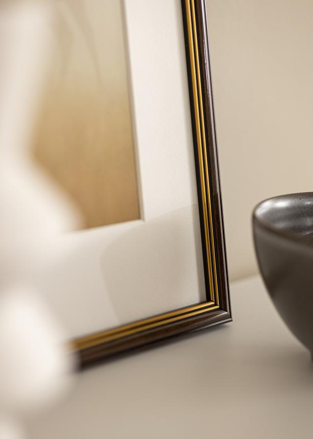 Klassisk smal treramme i brun, med gullkant nærmest motivet