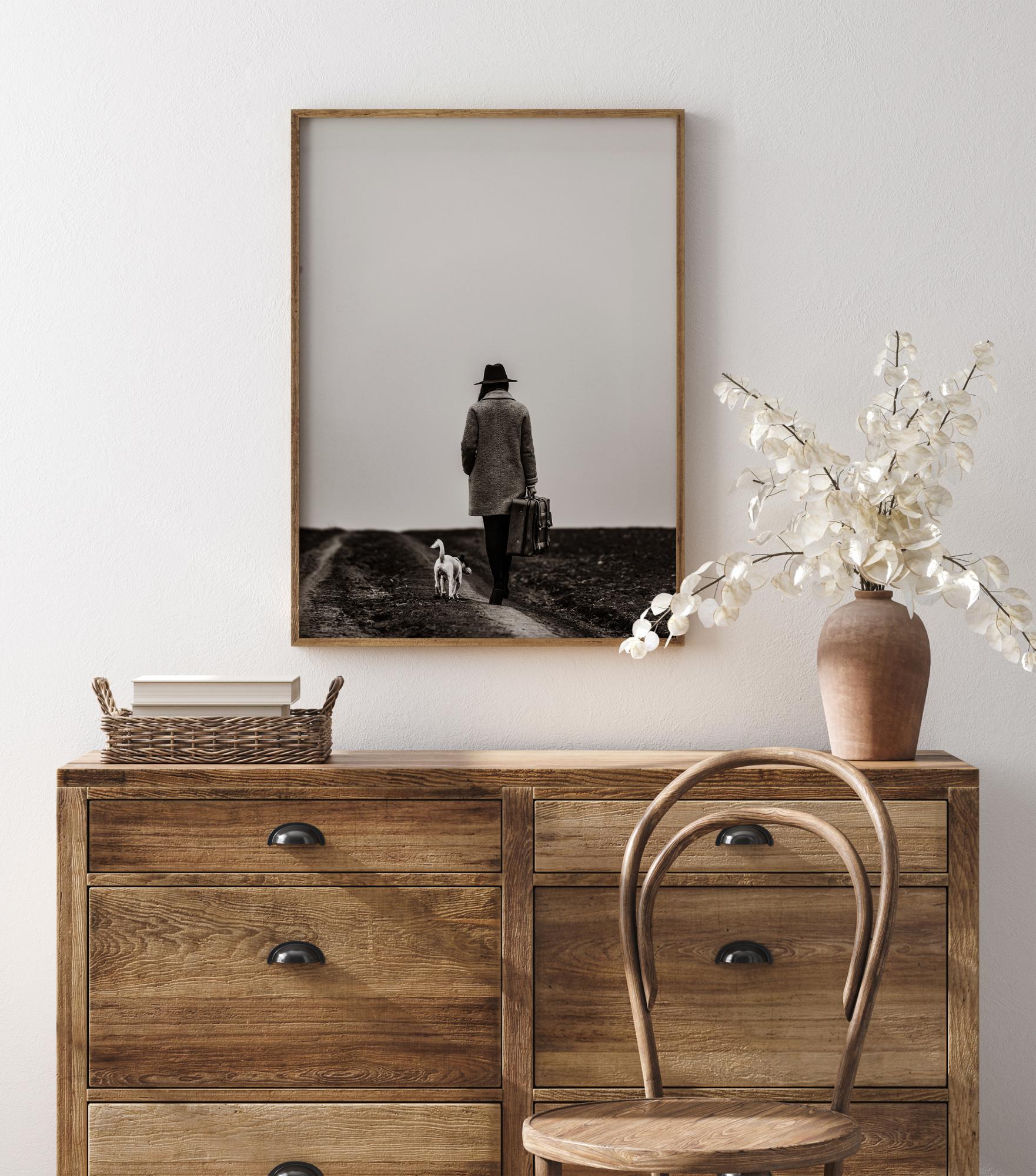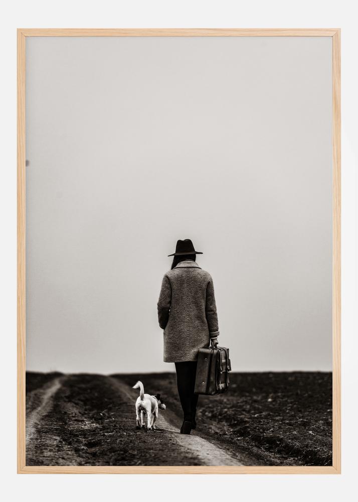 En minimalistisk plakat av en kvinne som går langs en sti med hunden sin. De to hjulsporene fører inn i det fjerne, mens kvinnen iført en lang jakke bærer en koffert, og terrieren hennes går ved siden av. Den brede hvite himmelen er innbydende. Bli med denne kvinnen på hennes reiser når du henger dette svart-hvitt-bildet på veggen din.