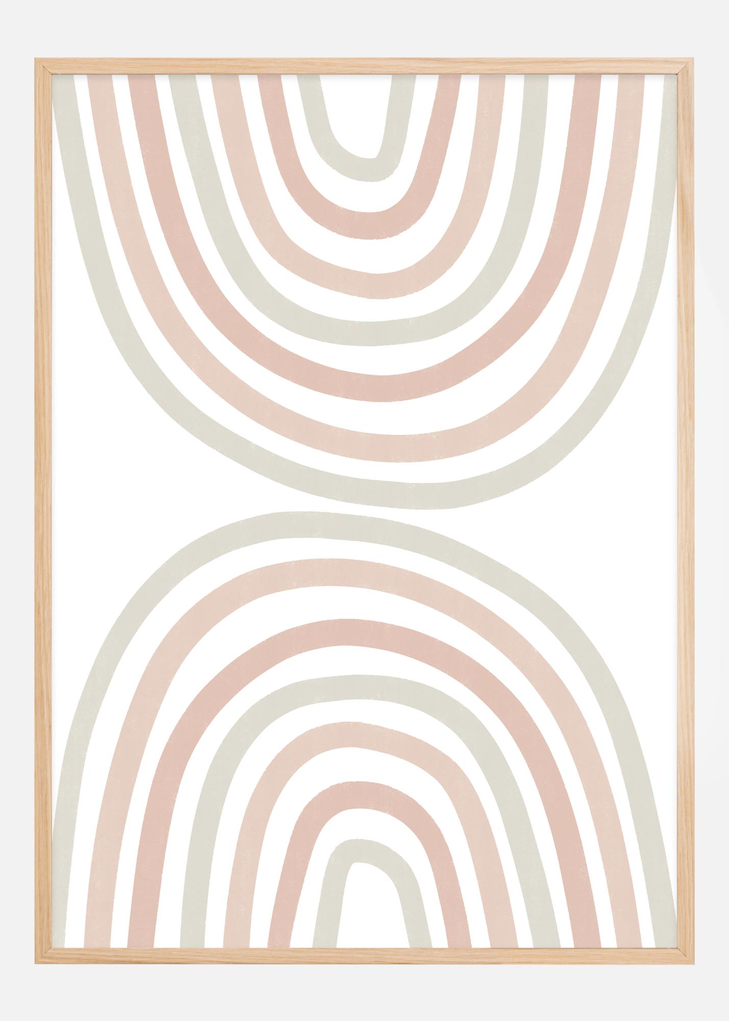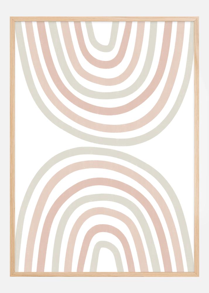 Denne moderne og minimalistiske plakaten, med tittelen "Double Rainbow", viser en serie konsentriske buer som danner en dobbel regnbue med et rolig og avslappet fargeskjema. De myke tonene av blått, beige og terrakotta er perfekt balansert for å skape en følelse av harmoni og ro i rommet ditt. De rene linjene og det enkle designet gjør denne trykken til et stilfullt tillegg til enhver moderne interiørdesign.