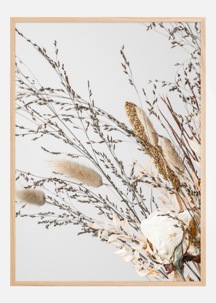 Denne posteren er en feiring av naturens stille eleganse, som fremstiller et variert arrangement av tørkede planter. Den naturlige komposisjonen er full av fine linjer og organiske former, fra de vaierende gressstråene til de robuste aksene og de subtilt tonede bladene. De tørkede plantenens brun-beige palett mot den rene hvite bakgrunnen gir en følelse av varme og natur som fanges i stillhet.