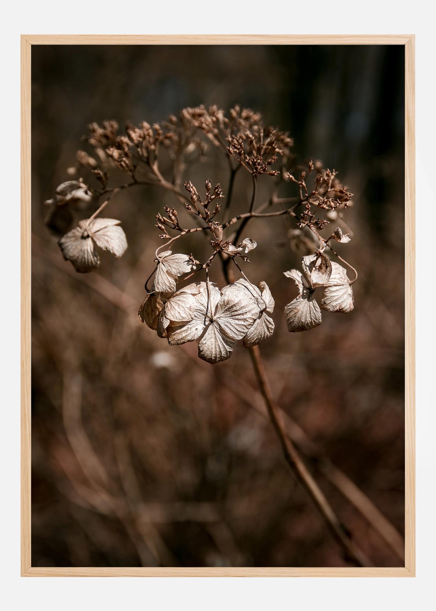 Mist deg i skjønnheten av forgjengelighet med denne tankevekkende posteren. Trykket fremstiller tørkede planteformer som fanger essensen av en svunnen sommer. Dens varme sepia- og bruntoner forteller en historie om vekst, overgang og naturens sykliske liv. Motivet skiller seg ut med sin detaljrike tekstur og de gjennomsiktige, skjøre bladene som bærer spor av tidens gang, og skaper en følelse av nostalgi og stillhet.