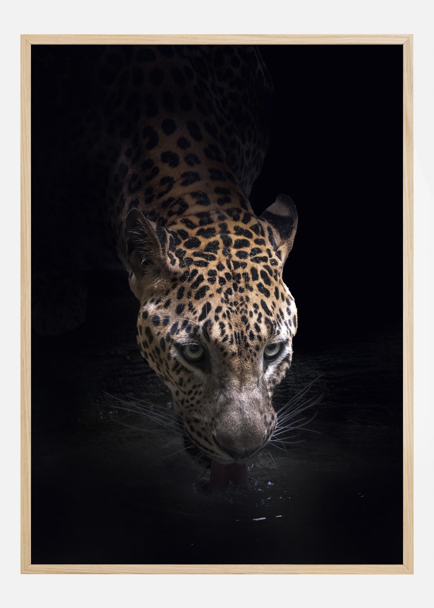 Denne dramatiske plakaten fanger en leopard i et intimt øyeblikk når den stille drikker vann, et kraftfullt øyeblikk av vill natur fanget i tiden. Den svarte bakgrunnen fremhever den majestetiske pelsens gyldne farge og de distinkte flekkene, som skaper en nesten tredimensjonal effekt. Leoparden vender seg mot betrakteren med et blikk fylt av et vilt dyrs konsentrasjon og tilstedeværelse, noe som gir en umiddelbar forbindelse mellom dyr og menneske.