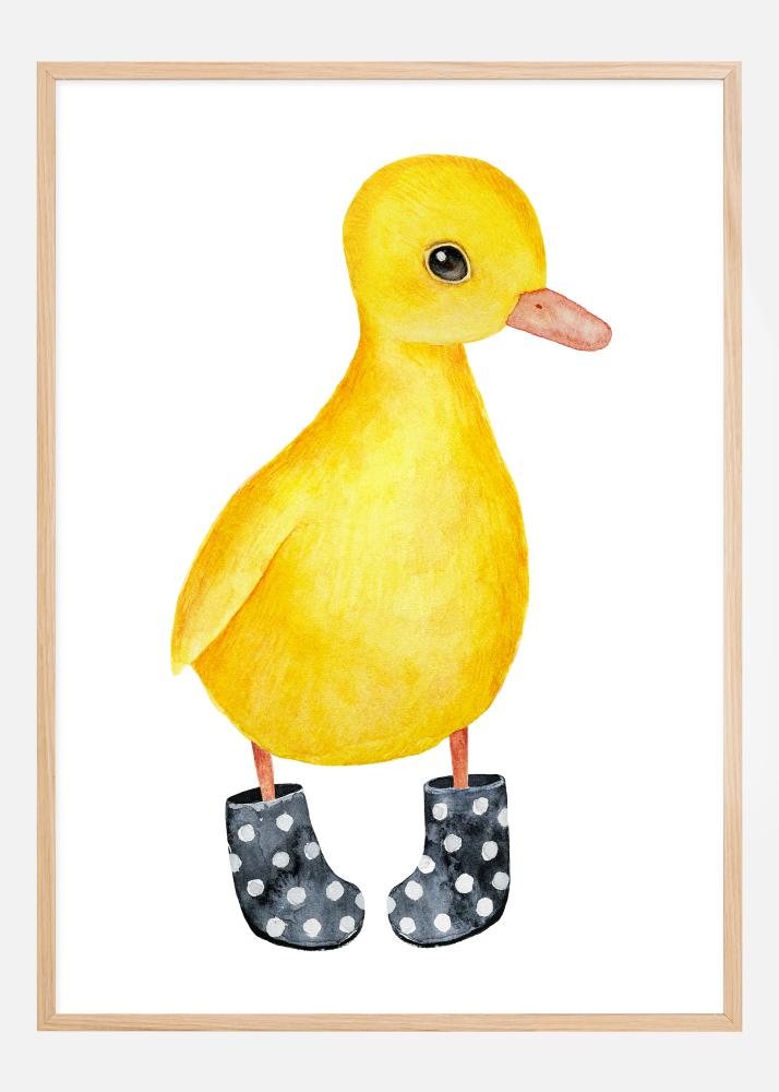 Oppdag sjarmen med vår solfylte andeplakat som sprer glede og spiller på strengene av det underfundige. Denne fortryllende illustrasjonen viser en nydelig, gul fjærkledd andunge iført et par prikkete gummistøvler - et bilde som garantert vil lokke frem smil. Det er en leken plakat som passer perfekt til et barnerom eller som en lys og glad detalj i hvilket som helst hjem, tilførende en følelse av glede og uskyldig eventyrlyst.