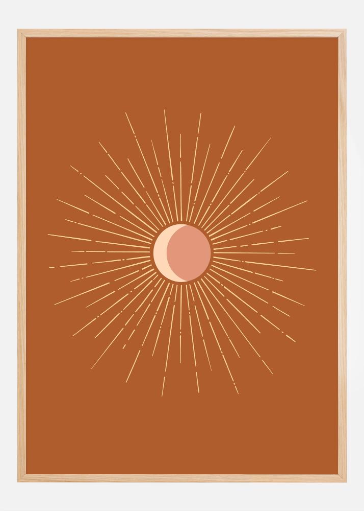 Denne minimalistiske og elegant designede plakaten med en abstrakt solformørkelse blir en stilren og moderne aksent på hvilken som helst vegg. Med dens rene linjer og strålende motiv mot en dyp terrakotta-bakgrunn, representerer dette trykket en perfekt blanding av enkelhet og sofistikasjon. Det sentrale elementet i designen, en sirkel med en eksplosjon av linjer, symboliserer lys og energi, og legger til en dynamisk effekt i rommet.