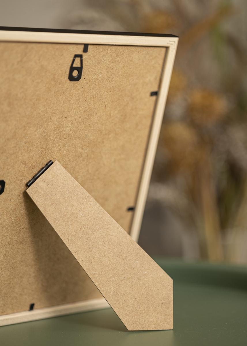 Denne bilderammen leveres med floatglass, som er et glass med litt bedre lysegenskaper enn vanlig glass, og det har i tillegg 40–45% UV-beskyttelse. Den brune baksiden er laget av MDF, og har opphengingsløkker til både vertikal og horisontal plassering. Baksiden holdes på plass ved hjelp av små metallstifter som du enkelt bøyer opp når du skal sette inn bildet. Rammen har en innerdybde på 8 mm, og god plass hvis du vil gjøre motivet komplett med en elegant passepartout.