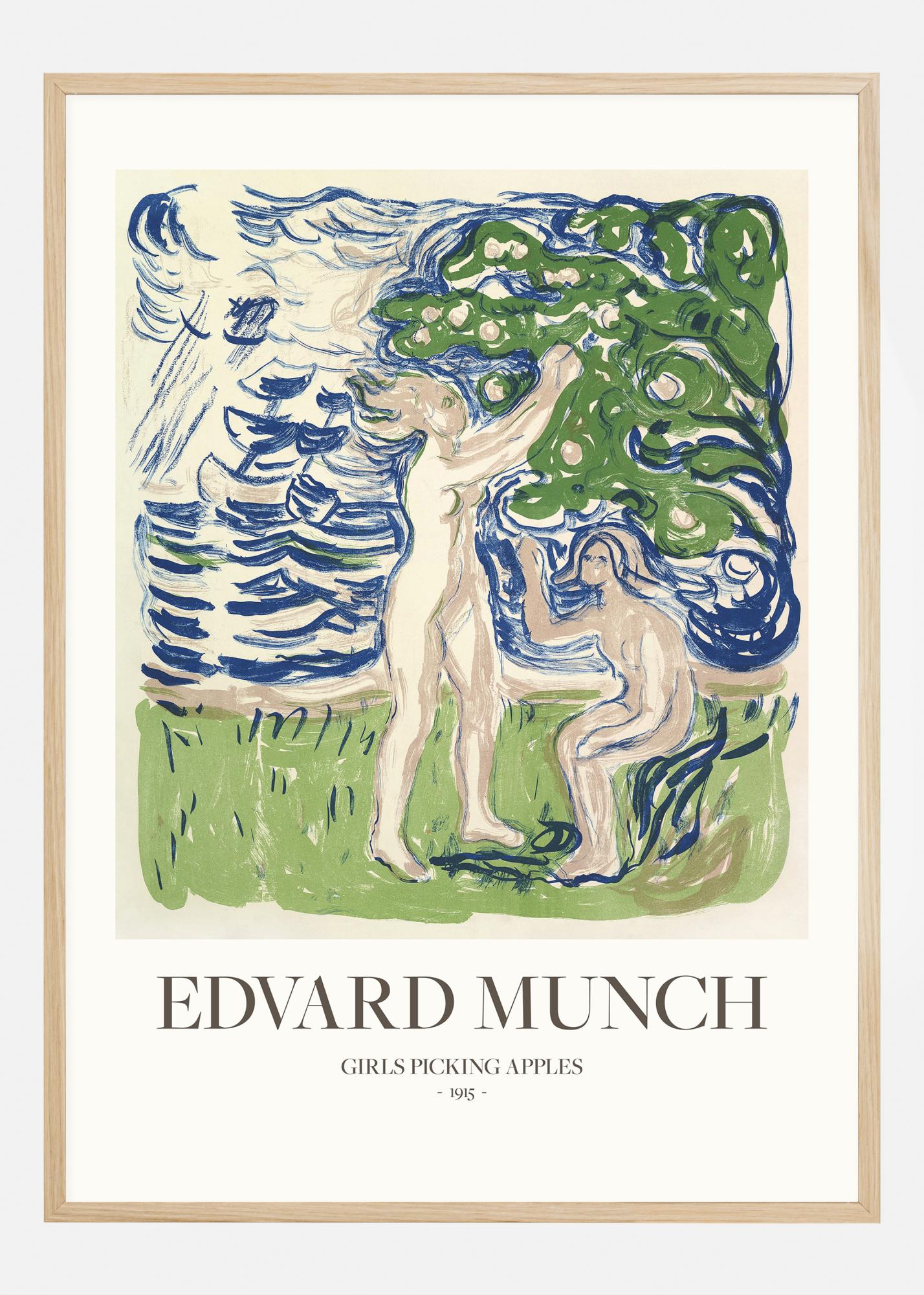 Denne posteren fremstiller 'Girls Picking Apples', et verk fra 1915 av Edvard Munch, som fanger en idyllisk og stemningsfull scene. Kunstverket gir en enkel, men uttrykksfull avbildning av to figurer blant trærne, deres kropper og ansikter fremhevet med løse, frie penselstrøk. Fargeskjemaet domineres av friskt grønt og jordnære brunt som skaper plenen og trestammene, mens den blå og hvite himmelen gir en levende bakgrunn som fremhever de klare eplegrønne tonene og de myke hudfargene. Denne printen er en hyllest til enkel glede i livet og en perfekt kunstnerisk berøring for å gi hvilket som helst rom en følelse av natur og frihet.