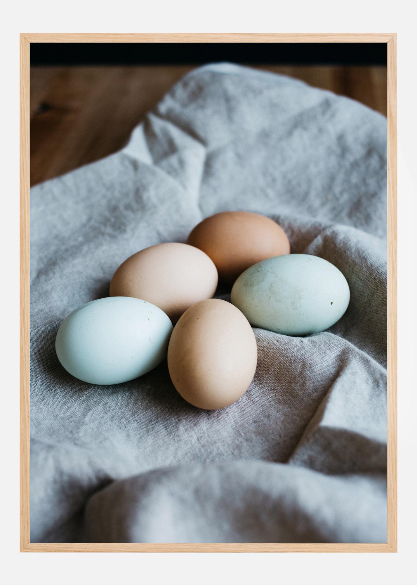 En stille liv-plakat med fem egg på en hvit klut på et bord. Eggene er i ulike brune og hvite farger og ser nylagte ut. De varme tonene skaper en rustikk følelse hvor du kan sette pris på den naturlige levende atmosfæren. Perfekt for å skape et landlig kjøkkenmoment.