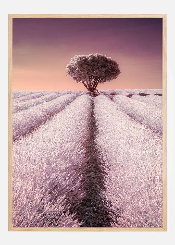 Gå inn i en drømmeverden av farger og fantasi med vår eksklusive plakat. Dette trykket utstråler en magisk følelse med dets pastellfargede himmel som går fra varme rosa til beroligende lilla nyanser. Motivene fremhever et ensomt tre, majestetisk sentrert langs den rene linjen av en lavendelåkerns sti. Denne plakaten er en visuell fest for øynene og vil passe perfekt som et sentrumselement i ethvert rom, og tilfører en touch av ro og skjønnhet.