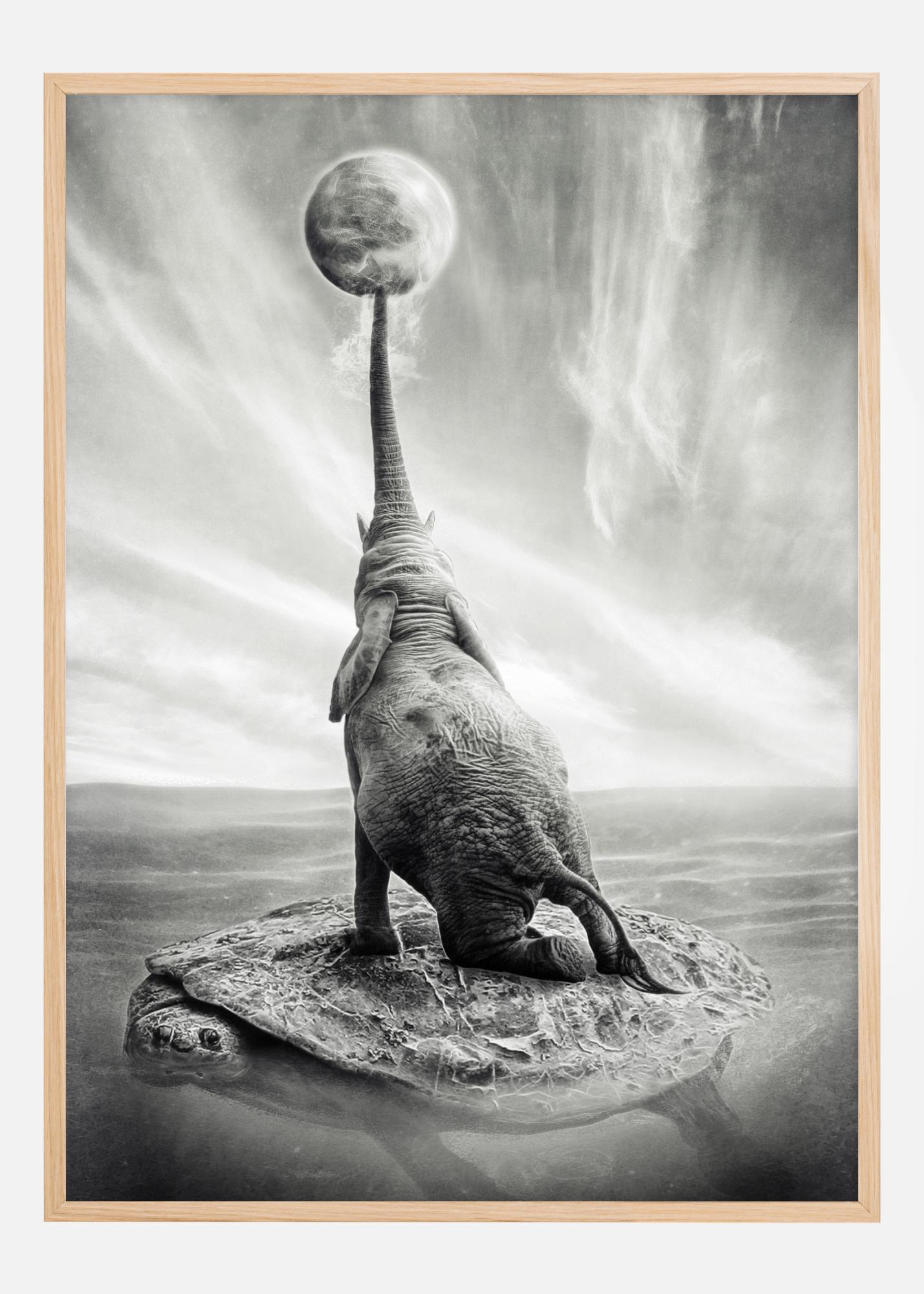 Denne fascinerende svart-hvite posters fanger et surrealistisk bilde av en elefant som står på en skilpadde og balanserer en verdenskule på snabelen sin. Bildet utstråler en kraftfull symbolikk og leker med elementer av mytologi og fantasi. Den teksturerte huden på elefanten og skilpadden, detaljert og fremtredende, gir en nesten taktil dimensjon til verket, mens den uskarpe bakgrunnen av skyer og landskap bidrar til en drømmende og etisk atmosfære.