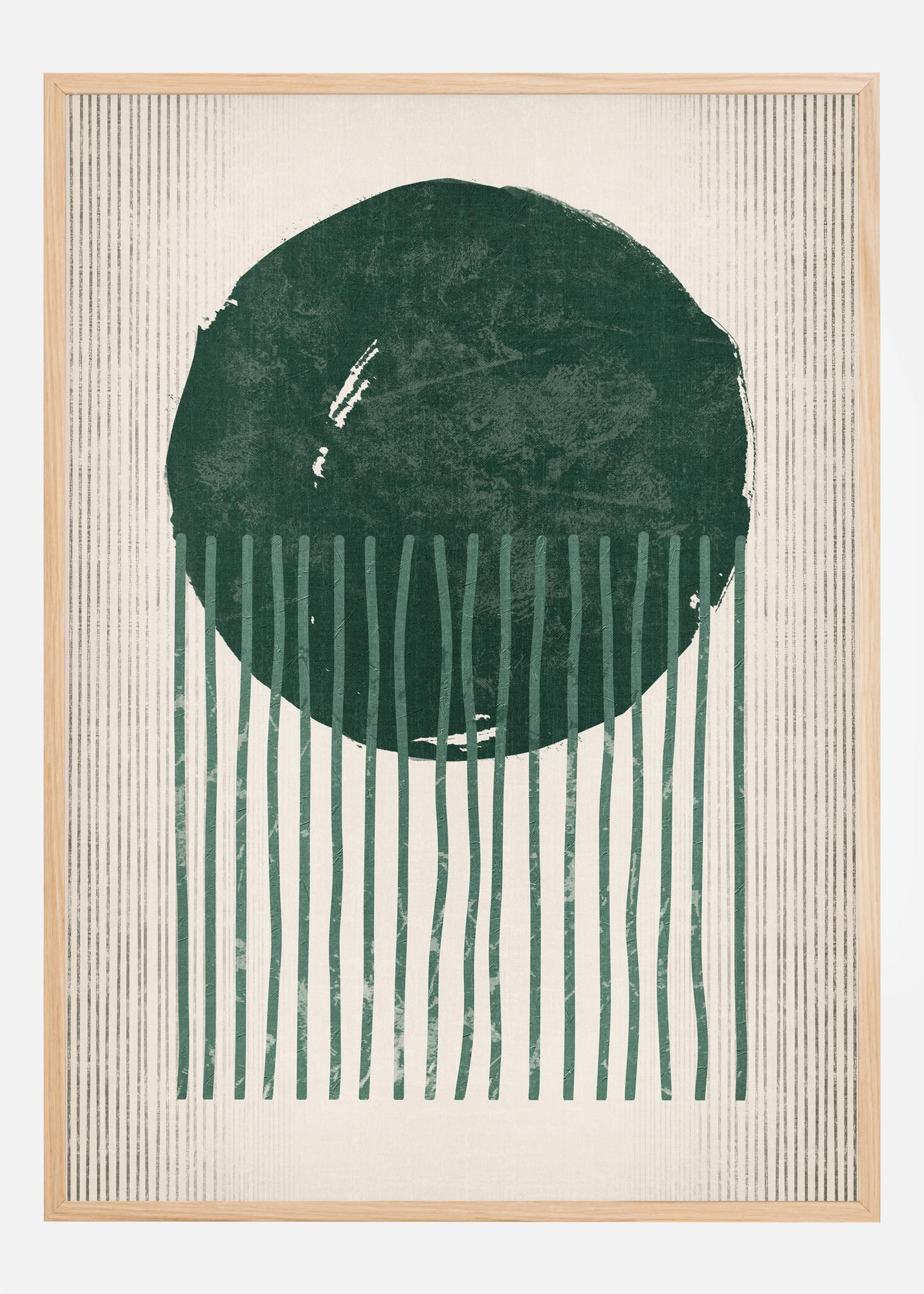 Denne plakaten inviterer til en fantasifull utforskning av det marine, med et stilisert bilde som minner om en manet med sine strømmende tentakler. Den sterke sirkulære formen i smaragdgrønn er både fengslende og beroligende, mens de hvitmalte, loddrette strekene som utgjør 'tentaklene' skaper en følelse av bevegelse. Dette er en kunstnerisk tolkning som kombinerer abstrakte former med biologisk fantasi og tilbyr en unik, modern vri på havtemaet.