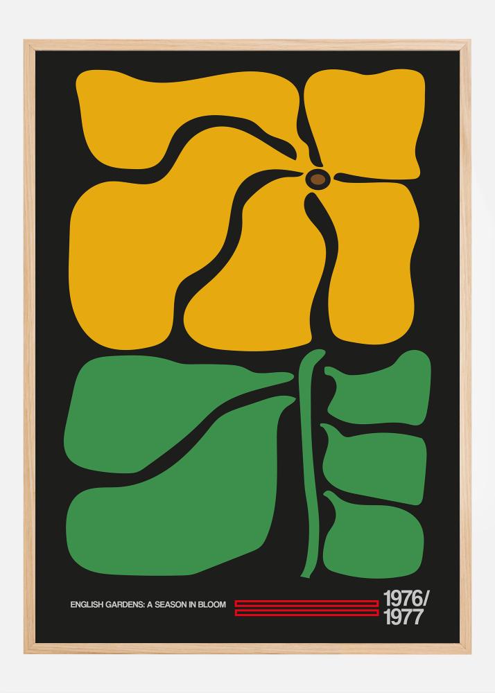 Fang essensen av britiske hager med vår 'English Gardens: A Season in Bloom' plakat. Denne iøynefallende plakaten er en hyllest til den tidløse skjønnheten av hager i full blomst. Med dens kraftfulle kontraster og dristige farger er dette et trykk som perfekt representerer den lekne og forfriskende ånden som finnes i hver blomsterprakt. Fremtredende farger inkluderer et rikt gult som minner om solen og frodige grønne toner som reflekterer hagens liv. Den dristige svarte bakgrunnen gir et moderne og elegant inntrykk, perfekt for den som vil skape en følelse av kraft og natur i hjemmet.