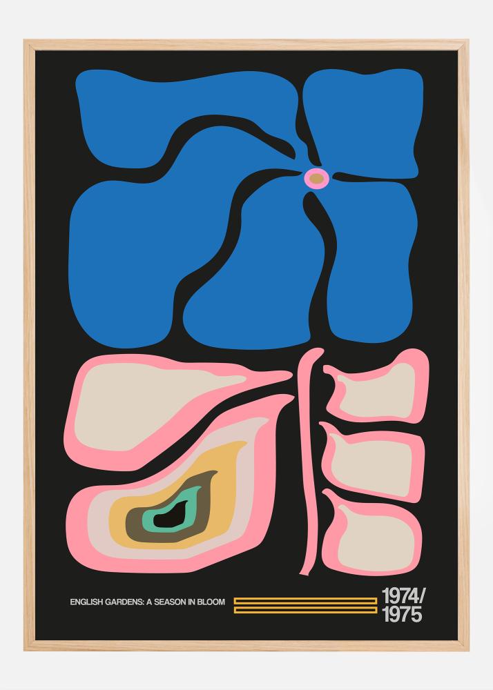 Denne kreative og fargerike 'English Gardens: A Season in Bloom' plakaten er en estetisk hyllest til hagenes blomsterprakt og mangfold. Plakaten fanger øyet med dens sterke, blå blomst som står i kontrast til en svart bakgrunn, komplettert med aksentfarger i rosa, beige, og et hint av grønt. Denne spesielle kombinasjonen av farger tilbyr en dristig og samtidsrett tolkning av en klassisk engelsk hage i full blomst. Årstallet '1974/1975' tilfører en historisk dimensjon som kanskje antyder en betydningsfull periode for hager eller kunsten.