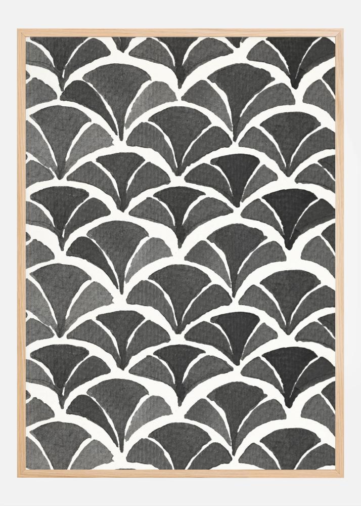 Gi plassen din et preg av kunstnerisk eleganse med denne plakaten som har et fengslende mønster av bladfjær i svart og hvitt. Dette trykket har et repeterende mønster som minner om vintagevifter, som er arrangert rytmisk over hele overflaten for å skape en følelse av bevegelse og symmetri. Den stilrene kontrasten mellom det svarte og det hvite gir et klassisk utseende som passer inn i mange forskjellige interiørstiler og miljøer.