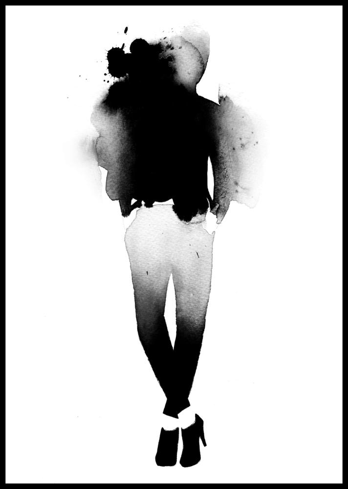 Plakat med en abstrakt moteillustrasjon med inspirasjon hentet fra designens verden. Originalen er et svart akvarellmaleri som har et "overeksponert" modellportrett. Det grafiske trykket gjør seg fint i en hvit ramme som ikke konkurrerer med motivet. Kombiner gjerne bildet med andre illustrasjoner i samme tema til en bildecollage.