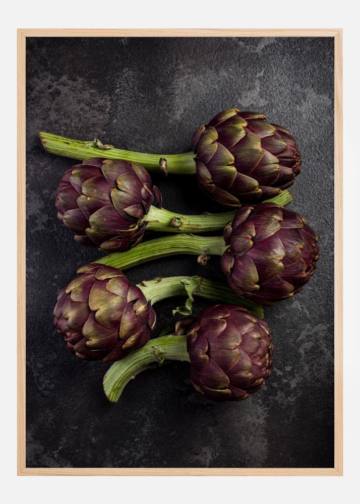Denne rustikke og naturinspirerte plakaten skildrer fem nyanserike artisjokker mot en mørk, teksturert bakgrunn. Det nærgående bildet fremhever de dypgrønne og purpurrøde nyansene i artisjokkenes blader, og det jordnære motivet ville passe godt i et kjøkken eller spisestue hvor det kan inspirere til kulinariske eventyr. Denne printen er ikke bare en hyllest til naturens skjønnhet, men også en påminnelse om fersk mat sin evne til å bringe mennesker sammen.