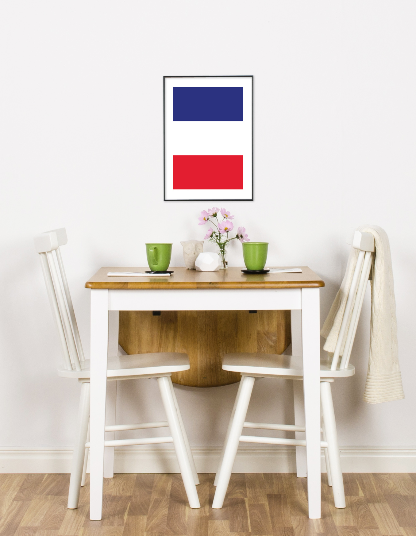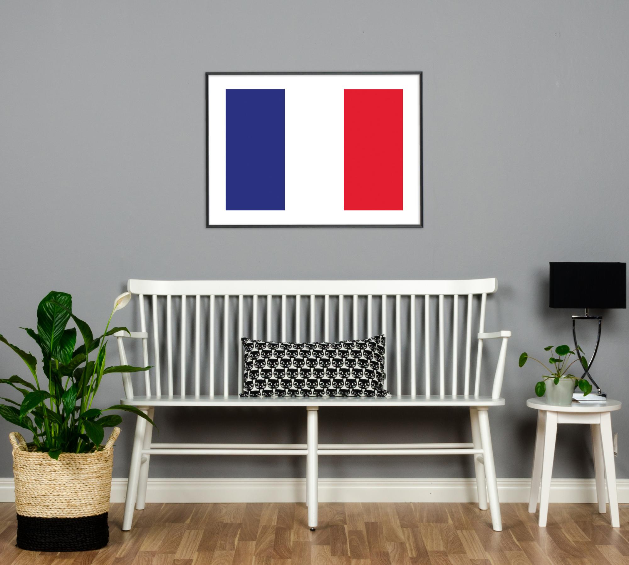 Finnes Frankrike i ditt hjerte eller ditt hjerte i Frankrike? Da blir dette stilrene flagget et personlig innslag i hjemmet eller på arbeidsplassen. Ettersom den finnes i hele 8 ulike størrelser finner du enkelt en til skrivebordet eller veggen. Kompletter gjerne med en svart ramme for å fremheve motivet ytterligere.