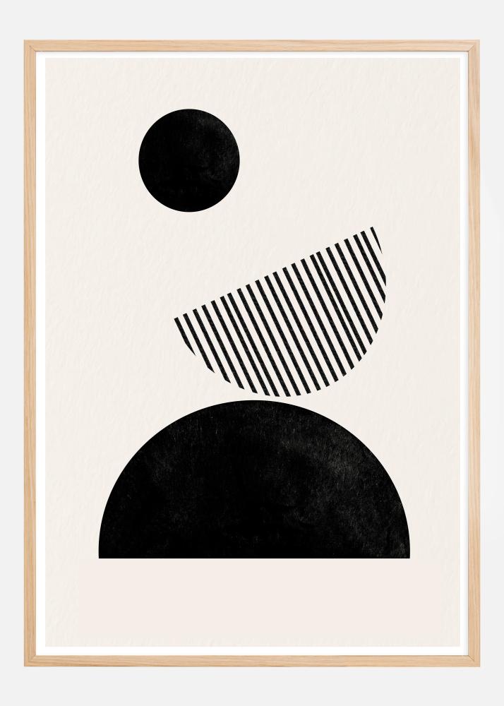 Denne kunstneriske plakaten kjennetegnes av sin lekne bruk av geometriske former og teksturer for å skape en balansert og moderne komposisjon. En stor svart sirkel sitter øverst, etterfulgt av en diagonalt riflet halvsirkel og en solid svart halvsirkel-form ved basen. Hvert element bidrar til en følelse av bevegelse og dynamikk, samtidig som den enhetlige fargepaletten skaper en følelse av sammenheng og enkelhet.