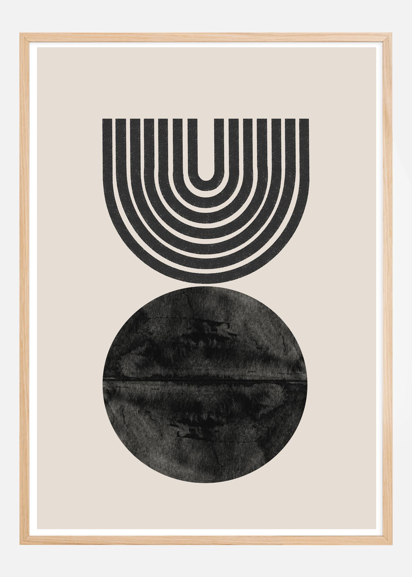 Denne kunstneriske plakaten fanger øyet med sin dristige kontrast og fascinerende komposisjon av geometriske og organiske former. Øverst fremtrer en serie svarte linjer som skaper en halvsirkel, noe som gir en sterk visuell struktur mot den rolige, nøytrale bakgrunnen. Nederst ser vi en teksturert svart sirkel som minner om refleksjoner i vann, noe som tilfører en dyp og mystisk kvalitet til designen. De utvalgte fargene i svart og off-white skaper en tidløs palett som appellerer til en rekke forskjellige smaker og interiørstiler.