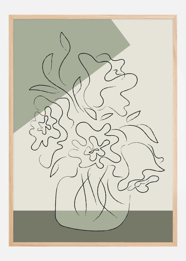 Denne kunstnerisk abstrakte poster avbilder stiliserte blomsterblad og bladverk i en elegant, flytende linjetegning, som svever over en tofarget bakgrunn av myke grønne og nøytrale toner. Designens enkle skjønnhet, forsterket av en svak tekstur som gir en organisk følelse, skaper en avslappet og rolig atmosfære. Denne moderne og stilrene printen ville passe perfekt inn i et minimalistisk eller skandinavisk inspirert hjem, og tilføre en touch av naturens ro uten å dominere rommet med for mye farge eller kompleksitet.