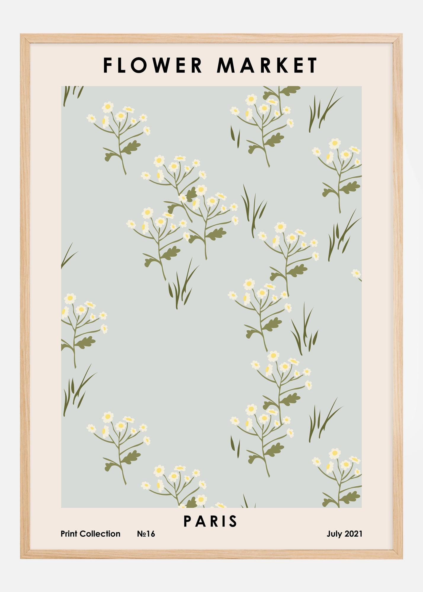 Denne sjarmerende og stilige plakaten tar deg direkte til hjertet av Paris med sitt bilde av et blomstermarked. Den presenterer et mønster av delikate hvite blomster mot en beroligende gråblå bakgrunn, som gir en følelse av friskhet og enkel eleganse. Øverst står teksten "FLOWER MARKET" i en klassisk typografi, mens bunnen inneholder teksten "Print Collection ?16 PARIS July 2021", som tilfører en følelse av autentisitet og kulturell kontekst.