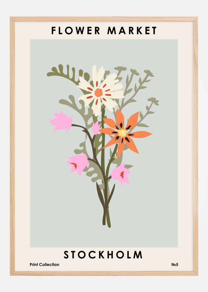 Denne plakaten gir et bilde av Stockholms blomstermarked, med en frisk og naturnær design som fanger byens pulserende skjønnhet og grønnhet. I denne printen harmoniserer lyslekene mellom blomstene og løvverket, som gir liv til de blomstrende motivene illustrert i nyanser av hvit, rosa og oransje, mot en mild blågrå bakgrunn. Det er en hyllest til den skandinaviske hovedstadens kjærlighet til naturen og dens evne til å blande tradisjon med moderne design.