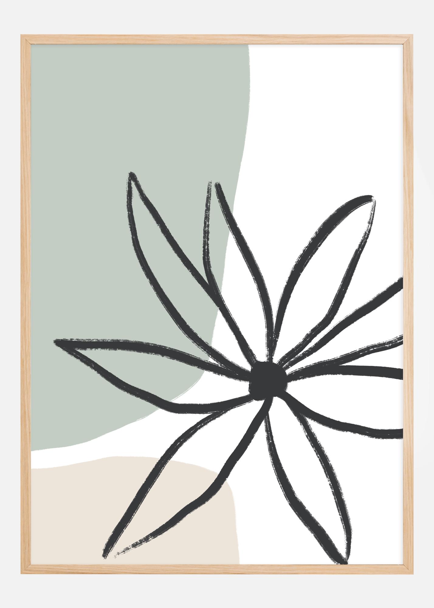 Denne plakaten, "Flower Mint and Cream", utstråler en enkelhet som er både moderne og tidløst elegant. Motivene dens presenterer en stilisert blomst i kraftige svarte penselstrøk mot en beroligende bakgrunn av mintgrønn, som skaper en kontrast som er både dristig og balansert. Den kremete, nøytrale tonen som fyller den nedre halvdelen av bildet gir en myk kontrast som kompletterer den minimalistiske designen.
