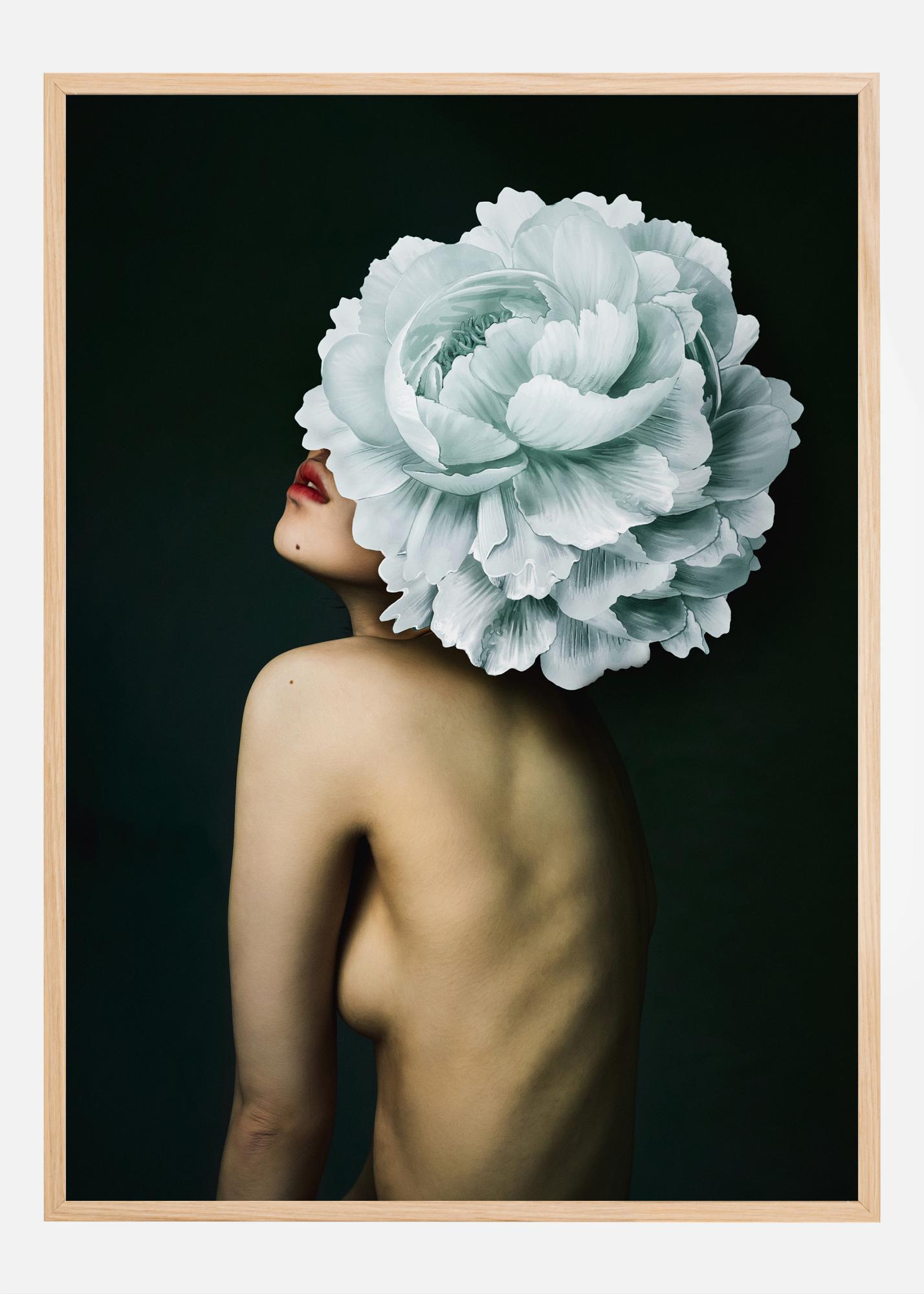 Denne plakaten portretterer en fascinerende og kunstnerisk komposisjon der menneskelig skjønnhet møter naturens underverker. Bildet viser en person sett bakfra, hodet erstattet av en storslått, nesten overdimensjonert blomst i hvitt. Kontrasten mellom den myke huden og den detaljrike blomsten skaper en visuell symbiose som er både drømmelignende og suggestiv. Printens fargeskjema er enkelt men kraftfullt, med nyanser av hvitt, hudtone og leppens dype røde, mot en mørk, nesten monokrom bakgrunn.