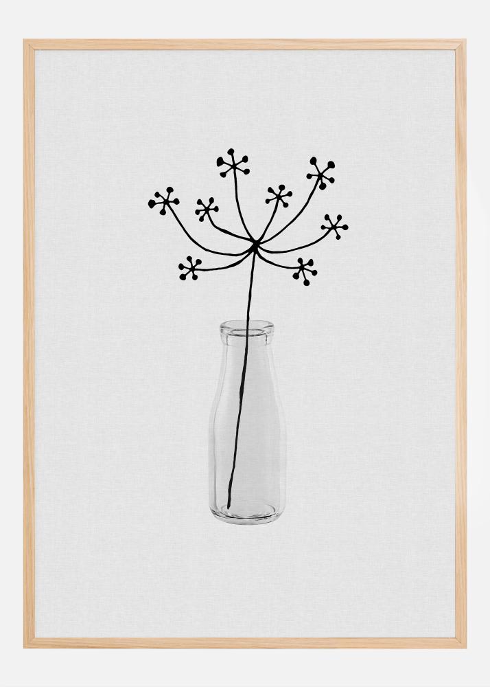 Denne sjarmerende og kunstneriske posteren fremstiller enkelheten og skjønnheten i en blomst i silhuett. Med sitt minimalistiske uttrykk fanger motivet essensen av en blomstrende plante med slående sorte konturer som hviler i en gjennomsiktig vase, noe som skaper et stilrent og beroligende bilde. Dette kunstverket er ideelt for å tilføre en touch av naturinspirert estetikk til en moderne interiørstil.