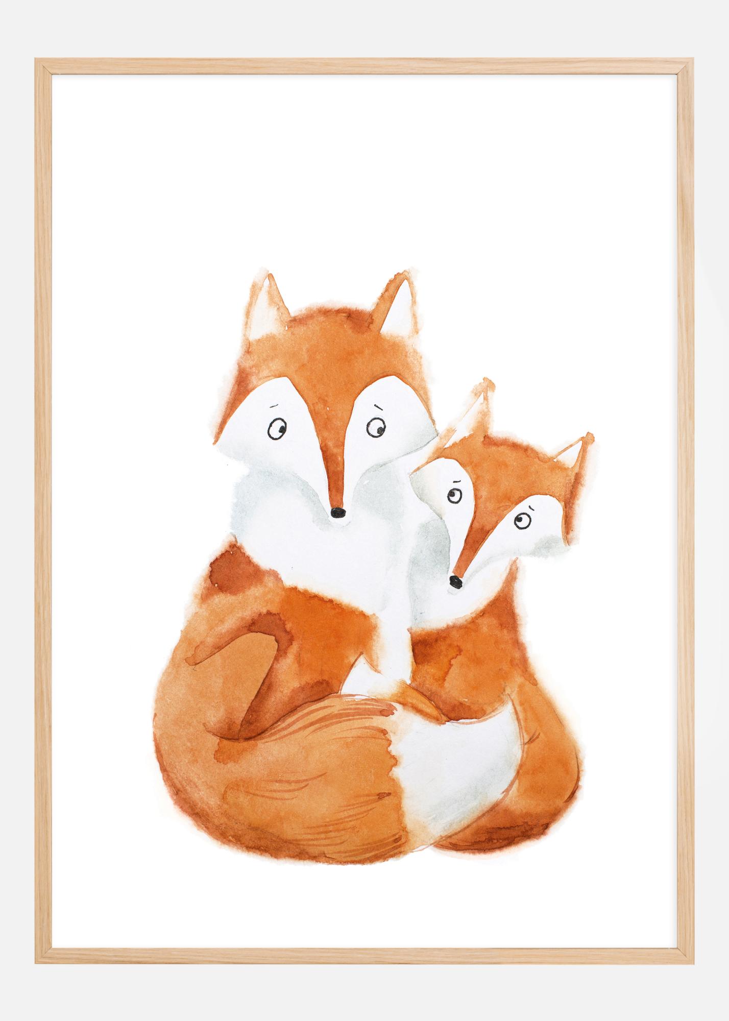 Innfør en følelse av varme og familiær nærhet med denne bedårende rev-familieplakaten. Den viser en stor rev som omfavner sin unge, et bilde som utstråler kjærlighet og trygghet. De myke, jordnære tonene av rustbrunt og hvitt i illustrasjonen gir en naturlig og beroligende effekt, perfekt for å skape en koselig atmosfære i et barnerom eller en annen del av hjemmet hvor varme og omsorg vil fremheves.